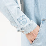 This denim hoodie blends the rugged appeal of a jacket with the comfort of a hoodie. Crafted in a light stone wash. It features a bold embroidered logo on the chest and a distinctive pig logo on the sleeve. Designed with button cuffs offering a stylish twist on classic denim outerwear. Whether layered or worn on its own, this hoodie delivers a perfect mix of laid-back and edgy style, making it a versatile piece for any casual wardrobe.